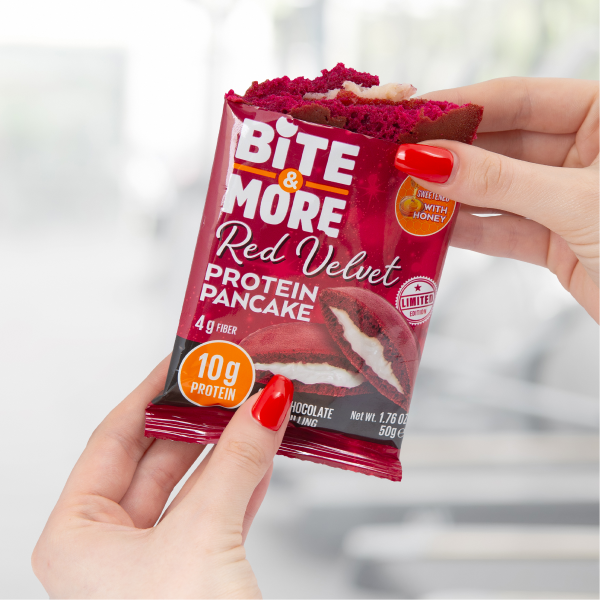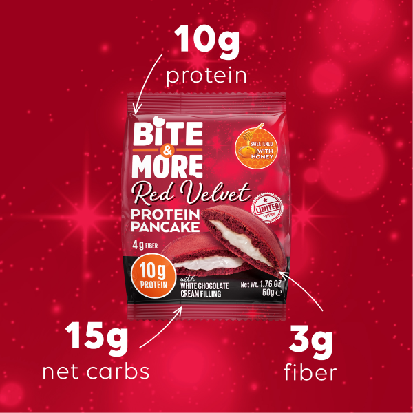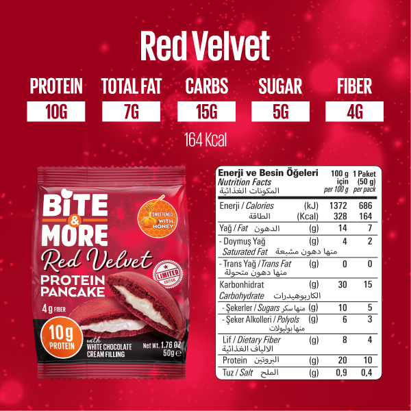 Bite & More Proteinli Pankek Red Velvet, günlük protein ihtiyacınızı desteklemek için özel olarak geliştirilmiş lezzetli ve pratik bir atıştırmalıktır. Her bir porsiyonda yüksek oranda protein içeren bu pankek, tatlı krizlerini bastırmak isteyenler için ideal bir alternatiftir. Red velvet aromasıyla damaklarda iz bırakırken, formunu korumak isteyenlerin de favorisi olmaya adaydır. Spor sonrası, kahvaltıda ya da gün içinde kolayca tüketilebilen bu ürün, protein barlara alternatif olarak tercih edilebilir.