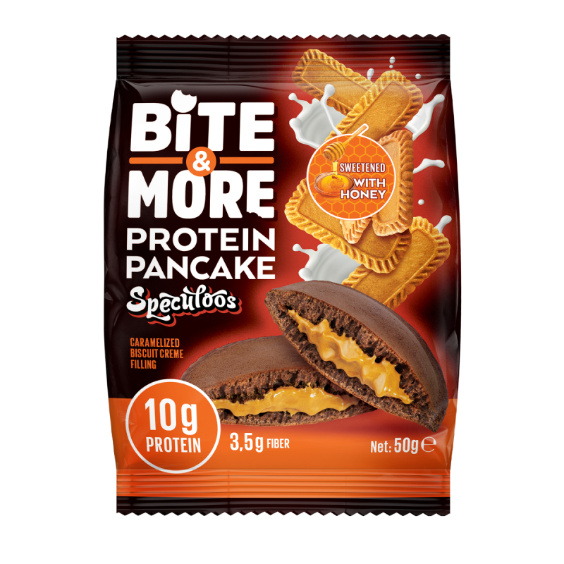 Bite More Proteinli Pankek Speculoos, sporcular ve sağlıklı yaşamı benimseyenler için özel olarak geliştirilmiş, lezzetli ve pratik bir atıştırmalıktır. Yüksek protein içeriği sayesinde günlük protein ihtiyacınızı desteklerken, yumuşacık pankek dokusu ve eşsiz Speculoos aroması ile damaklarda iz bırakır.