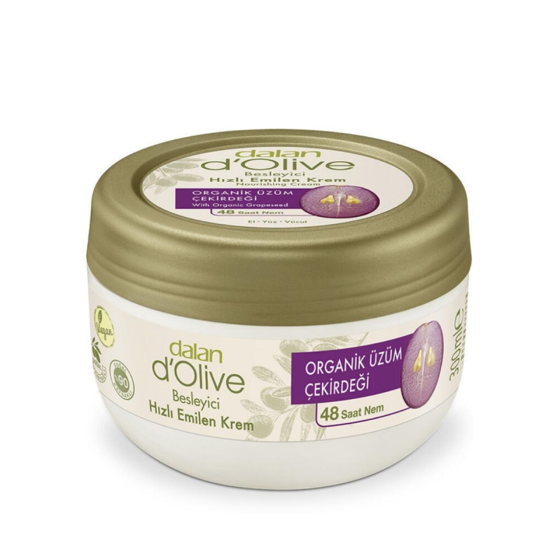 Dalan d'Olive Organik Üzüm Çekirdeği Krem, cildinize derinlemesine nemlendirme ve yoğun bakım sunar. Organik üzüm çekirdeği yağı ile zenginleştirilmiş bu krem, cildinizi besler, yeniler ve doğal bir parlaklık kazandırır. Güçlü antioksidanlar ve vitaminler sayesinde cildi korur, elastikiyetini artırır ve yaşlanma belirtilerini azaltır. Hafif ve hızlı emilen formülü ile ciltte yağlı bir his bırakmadan günlük kullanım için uygundur. Geniş 300 ml boyutu ile uzun süreli kullanım sağlar ve cildinizi sağlıklı, yumuşak ve pürüzsüz bir görünüme kavuşturur. Tüm cilt tiplerine uygun olan bu krem ile cildinize hak ettiği doğal bakımı sağlayın.