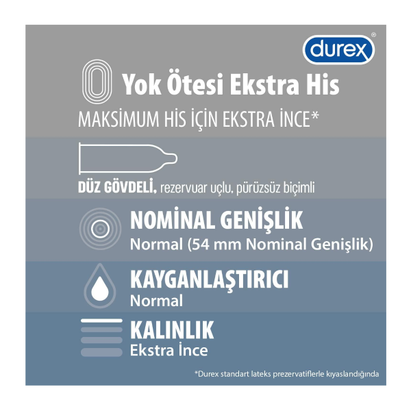 - Paket İçeriği: 10 adet prezervatif (2 Adet Durex Klasik, 4 Adet Durex Yakın Hisset Standart Fit, 4 Adet Durex Yok Ötesi Ekstra His)
