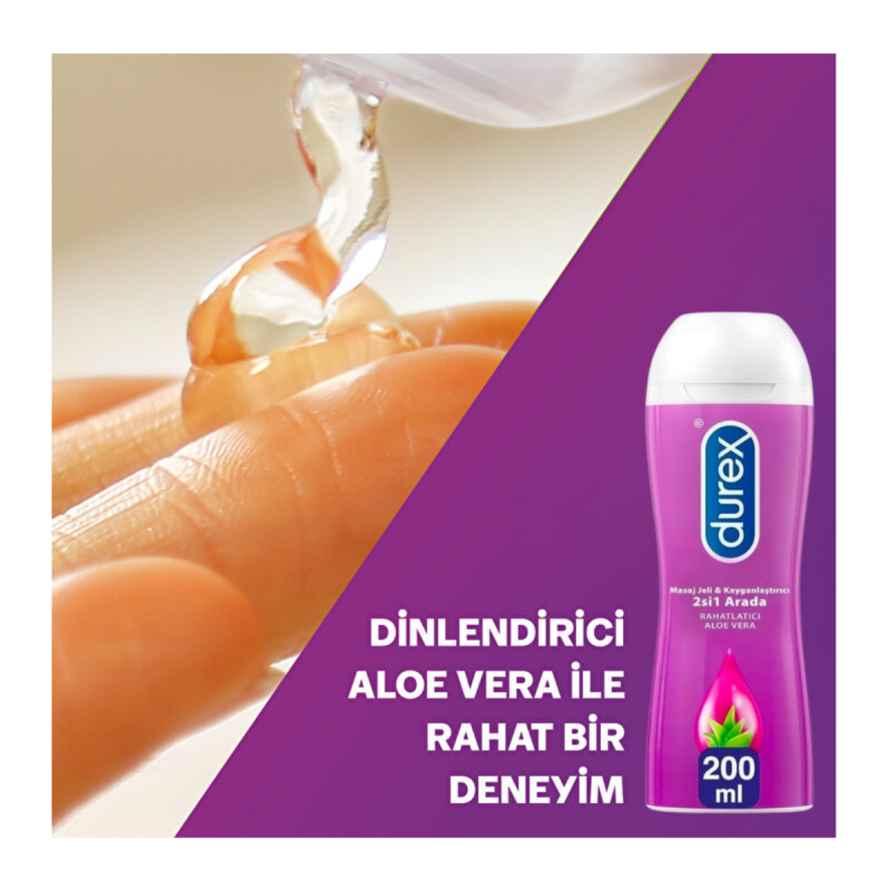 Durex Masaj Jeli 2'si 1 Arada Aloe Vera, cinsel ilişki sırasında hem kayganlaştırıcı jel olarak hem de masaj jeli olarak kullanılabilen çok yönlü bir üründür. Aloe Vera'nın yatıştırıcı ve nemlendirici etkisi sayesinde cilt üzerinde rahatlatıcı bir his bırakırken, su bazlı formülü ile cinsel ilişki sırasında ekstra kayganlık sağlar. Yapışkanlık hissi bırakmayan bu jel, hem vücut masajı için hem de cinsel ilişki sırasında kullanım için idealdir.