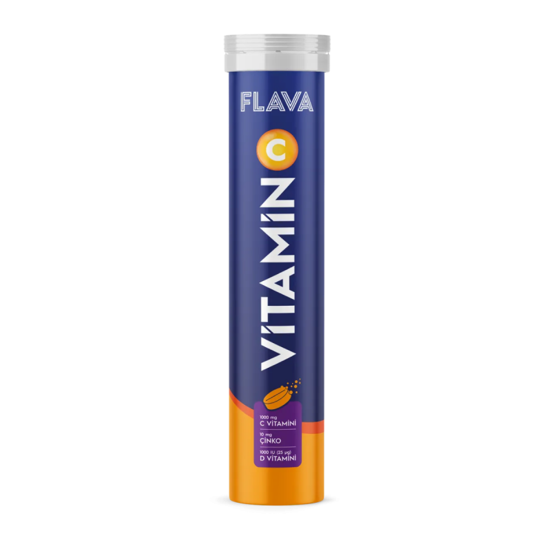 FLAVA C Vitamini efervesan, 20 adet efervesan tablet içermektedir. C Vitamininin yanı sıra Çinko ve D Vitamini içeriği ile kompleks bir formüle sahiptir.