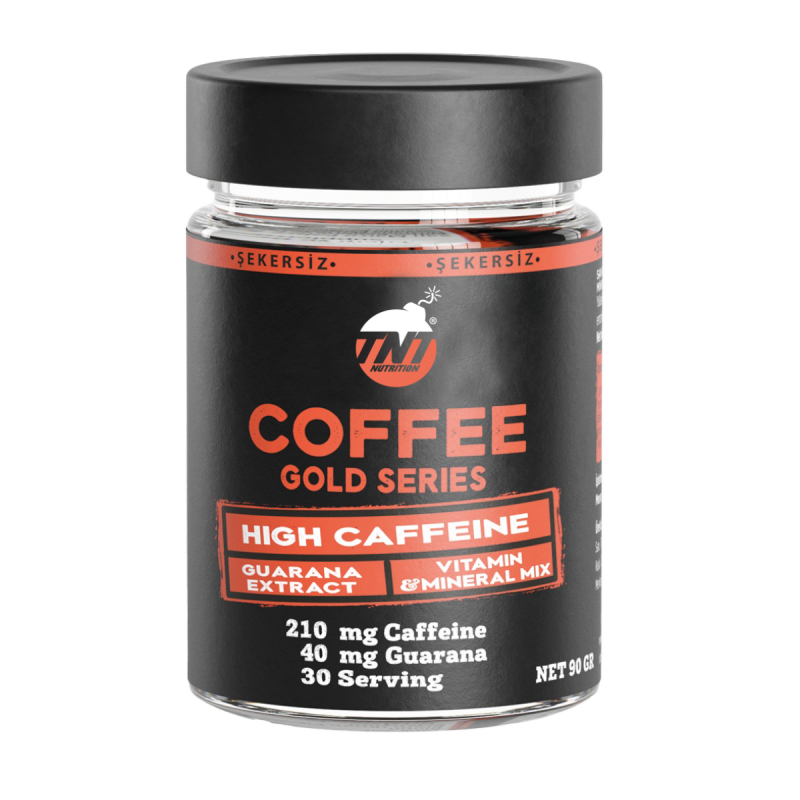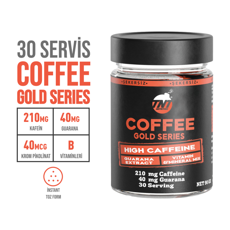 TNT Kahve Karışımı ve Guarana Ekstresinden gelen kafein sayesinde 1 porsiyonda 210 mg Kafein içermektedir. TNT COFFEE GOLD SERIES eşsiz kahve tadı ve yumuşak içimiyle sizleri bekliyor!