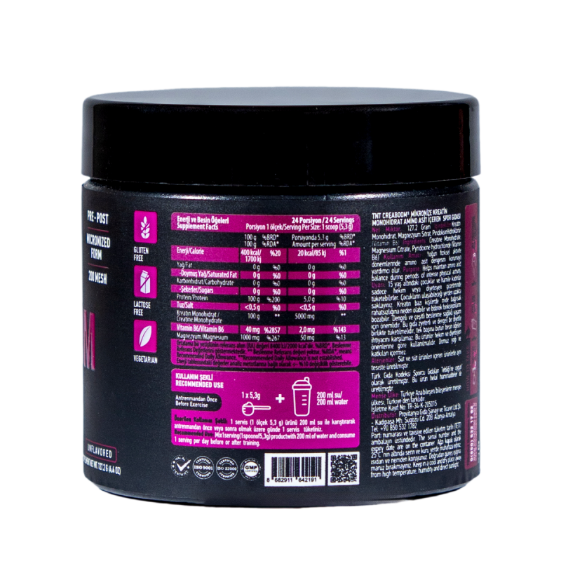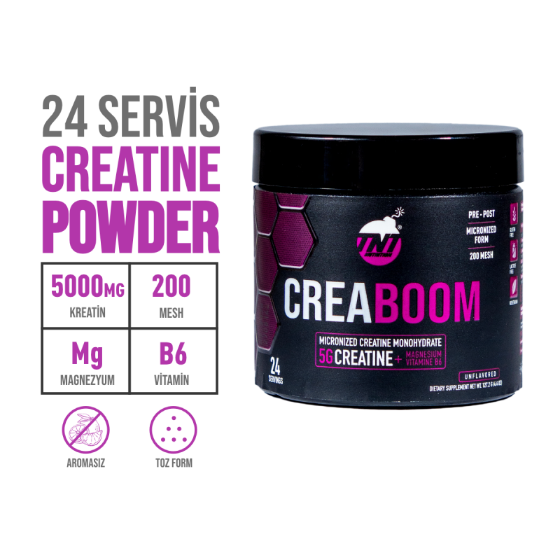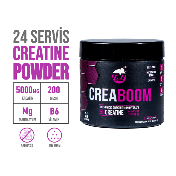 TNT Creaboom, toz formda Mikronize Kreatin Monihidrat içeren özel formüle sahip bir üründür. Creaboom, vücut tarafından hızla emilen en ince mikronize forma (200 mesh) sahiptir.
