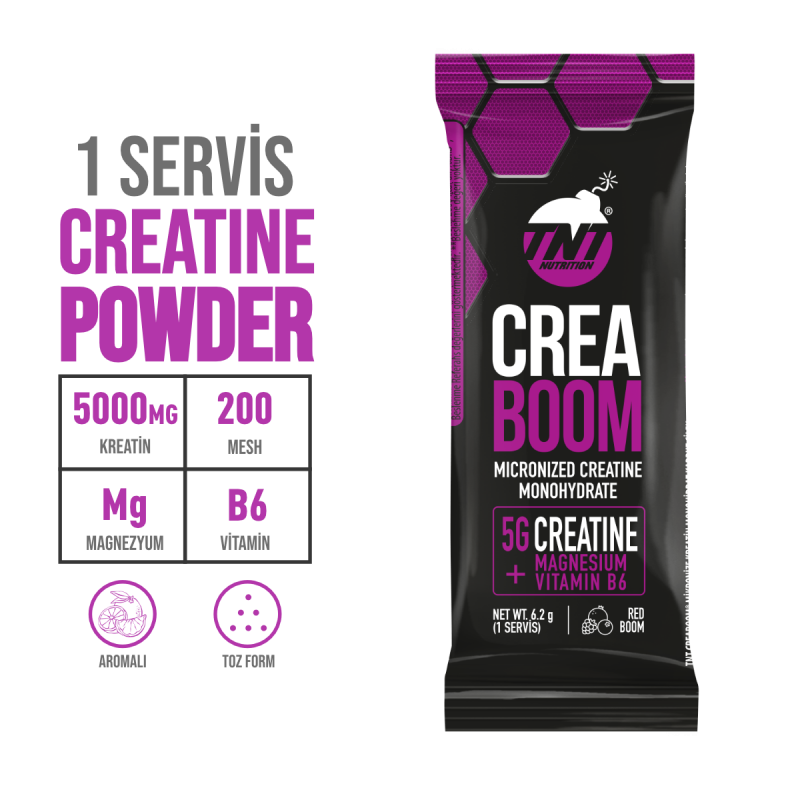 TNT Creaboom, toz formda Mikronize Kreatin Monihidrat içeren özel formüle sahip bir üründür. Creaboom, vücut tarafından hızla emilen en ince mikronize forma (200 mesh) sahiptir.