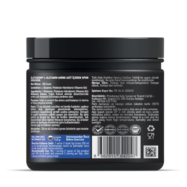 TNT Glutaboom, toz formda L-Glutamin amino asiti içeren bir üründür. Glutaboom, fermente edilmiş hammadde ile üretilmiş olup, alerjen riski taşımamaktadır. Yoğun egzersiz yapan sporcuların ihtiyaçlarına yönelik geliştirilmiş ve üretilmiş premium bir üründür. TNT GlutaBoom L-Glutamine, Vitamin B6 ile zenginleştirilmiş sindirimi kolay formülü sayesinde sporcuların antrenman verimine destek sağlar. TNT Nutrition’ın ham madde menşei Avrupa’dır.