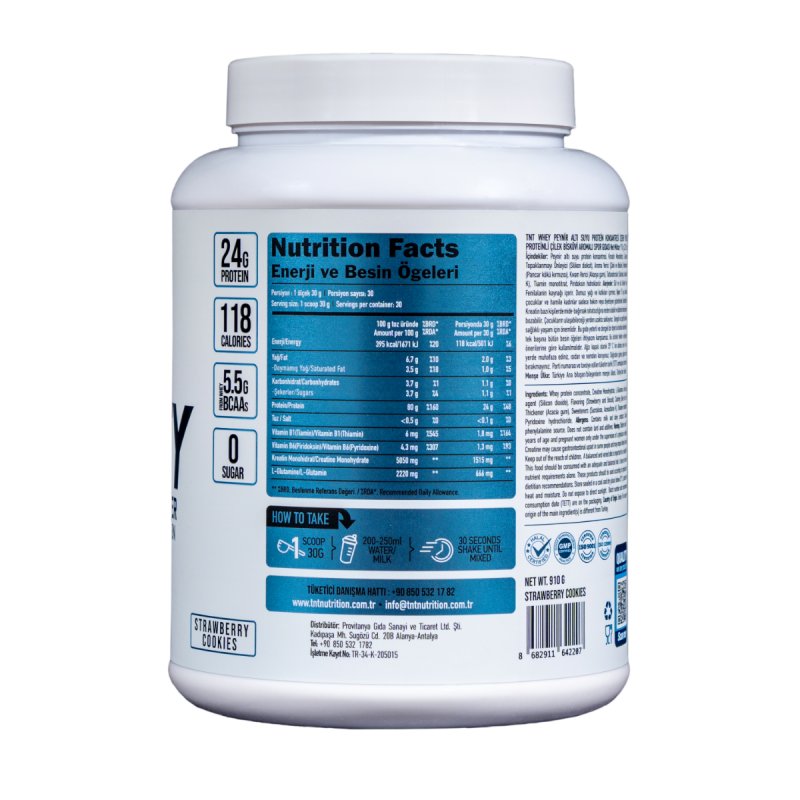 TNT Whey, yüksek kaliteli konsantre whey protein (WPC80) kaynağı kullanılarak üretilmiştir.